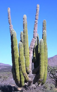 The Baja Saguaro, Pachycereus pringlei, native to Mexico, and Baja, California, is one of the magnificent desert giants. Known in Mexico as "Cardon", this branching columnar cactus is similar to the Saguaro of Arizona. Forms massive columns to over 30' in height, with bases up to 3' in diameter. Often lives more than 100 years. It has waxy gray green columns with ribs, white areoles and stout grayish spines as juveniles, but columns are nearly spineless with age. the nocturnal white flowers are pollinated by bats.